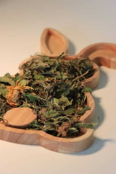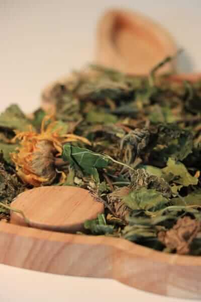 Ingrediënten: Wilde kaasjeskruid, paardenbloem, weegbree, brandnetelbladeren, moerbeibladeren, goudsbloembloemen, hibiscus, duizendbladeren, kamille, hazelnootbladeren, wilgenbladeren en koudgeperste lijnolie.