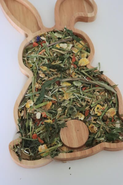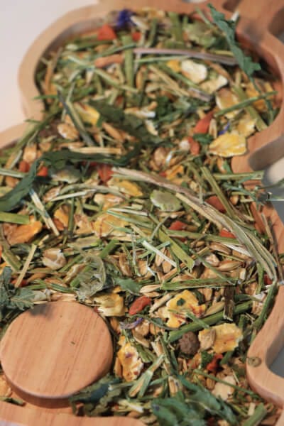 Ingrediënten: Luzerne, haver, wortelstukjes, peterselie, erwtenvlokken en koudgeperste lijnzaad.