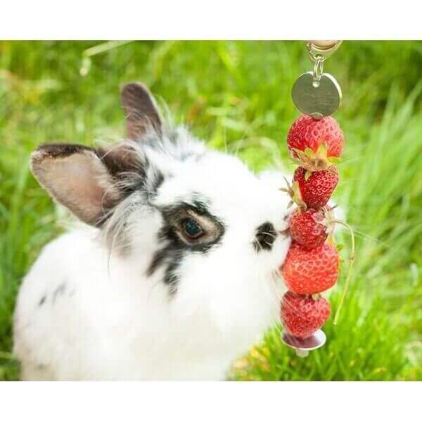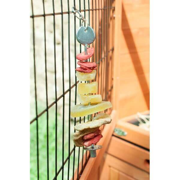 De spies hang je vervolgens bovenin het hok. Jouw dieren moeten zo eerst meer moeite doen om bij het eten te komen (foerageren). En zo blijft jouw fruit schoon en fris zonder dat er bodembedekking aan blijft plakken en jouw dieren dit inslikken. Een superhandige oplossing dus!